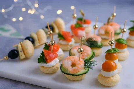 Ассорти канапе на шпажках — изысканная закуска для праздника или фуршета. Основы из слоёного теста удачно сочетаются с разными вкусами: морепродукты, сыр, свежие овощи и ...