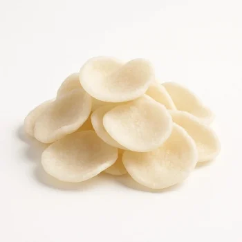 Креветочные чипсы — популярная закуска, происходящая из стран Юго-Восточной Азии, особенно востребованная в китайской, тайской и индонезийской кухнях. Основой для их приготовления служит смесь крахмала (чаще всего тапиокового или картофельного), перемолотых сушёных креветок, соли и воды. Тесто раскатывают в тонкие листы или формуют в цилиндры, затем сушат, нарезают на тонкие ломтики и хранят в таком виде до последующего жарения. Перед подачей чипсы обжаривают во фритюре — в результате они моментально увеличиваются в объёме, становятся воздушными, хрустящими и приобретают лёгкий морской вкус с характерным ароматом креветок. Цвет готового изделия — от белого с розовым отливом до светло-кремового или слегка золотистого. Креветочные чипсы отлично подходят в качестве самостоятельной закуски, а также используются как гарнир к блюдам из риса, супам, салатам и разнообразным дипам. В азиатских странах их часто подают в начале трапезы или используют для украшения основных блюд благодаря оригинальному внешнему виду и интересной текстуре. Продукт отличается высокой калорийностью за счёт содержания крахмала и масла после жарки, при этом содержит умеренное количество белка животного происхождения. Чипсы не требуют долгого приготовления и отличаются длительным сроком хранения в сухом виде. Их вкус ценят за необычное сочетание хруста, нежного морепродуктового послевкусия и лёгкой пряности.