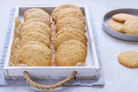 Кунжутное печенье — это лёгкое угощение с ярким ореховым ароматом, приготовленное на основе сливочного масла и большого количества кунжута. Текстура получается хрустящей, а тонкие пластинки ...