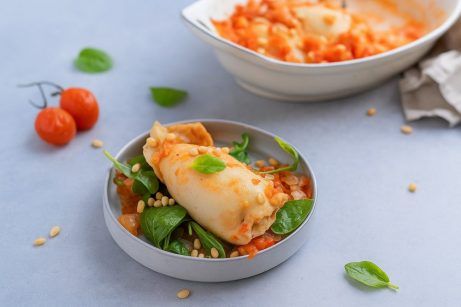 Нежные тушки кальмаров фаршируют рисом с кедровыми орехами и рубленым кальмаром, быстро обжаривают для румянца и доводят в томатном соусе в духовке. Начинка получается зернистой ...