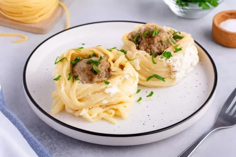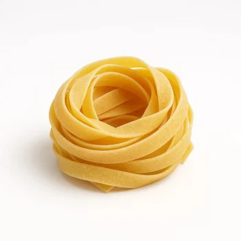 Паста тальятелле — это традиционный итальянский вид макаронных изделий, отличающийся длинной и плоской формой, напоминающей ленты шириной около 7–8 мм. Тальятелле готовят из твёрдой пшеницы (дурум) и чистой воды, а иногда с добавлением яиц, что придаёт пасте эластичность, яркий жёлтый цвет и насыщенный вкус. Благодаря своей плотной и ровной структуре, тальятелле отлично удерживают соусы — сливочные, мясные, грибные, овощные, идеально подходя для насыщенных и сложных блюд. Классическое блюдо с этой пастой — тальятелле аль рагу (болоньезе), где широкие ленты плотно обволакиваются густым мясным соусом. Тальятелле богата сложными углеводами, которые обеспечивают стабильную энергию, содержат растительный белок, минимальное количество жиров и практически не содержат сахаров, что делает продукт доступным для разнообразных диет, в том числе спортивных и сбалансированных. В составе присутствуют витамины группы B, минеральные вещества — железо, магний, калий. Перед приготовлением сухую пасту отваривают в большом объёме подсоленной воды до состояния al dente, чтобы сохранить характерную упругость. Тальятелле широко используется в итальянской и международной кухне для создания авторских и классических рецептов, прекрасно сочетается с овощами, морепродуктами, сыром, зеленью, соусами на основе томатов, сыра и сливок. Этот вид пасты добавляет оригинальности внешнему виду блюда, смотрится аппетитно и элегантно на тарелке, насыщает и легко усваивается при умеренном употреблении.