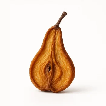 Вяленая груша — это натуральный фруктовый продукт, получаемый путём длительного высушивания свежих спелых груш при низких температурах без добавления сахара и консервантов. Такой способ обработки позволяет полностью сохранить богатство вкуса, натуральную сладость и ценные питательные вещества, присущие свежим фруктам. У вяленой груши насыщенный медовый аромат, карамельно-янтарный оттенок, очень мягкая, эластичная текстура и выраженный сладкий вкус с лёгкой фруктовой кислинкой. Продукт отличается высоким содержанием пищевых волокон, которые способствуют здоровому пищеварению и надолго насыщают, а также обилием природных сахаров, что делает его отличной альтернативой кондитерским сладостям. Вяленая груша богата витаминами группы B, витамином С и РР, а также важными для организма минералами: калием, магнием, железом, фосфором. В составе много антиоксидантов, поддерживающих иммунитет и помогающих бороться с воздействием свободных радикалов. Благодаря высокой концентрации натуральных сахаров продукт довольно калориен, однако его употребление в умеренных количествах может стать полезной частью сбалансированного рациона, особенно при активном образе жизни. Вяленая груша используется в кулинарии для приготовления десертов, выпечки, домашних гранол и мюсли, а также в соусах и мясных блюдах, часто выступает в роли изысканной закуски или украшения блюд.