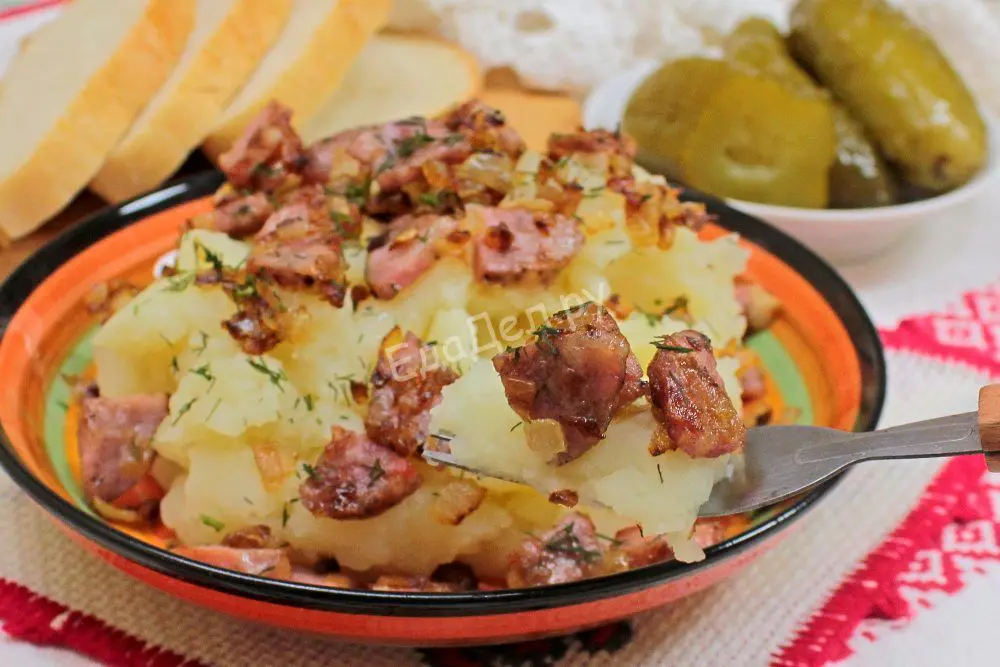 Когда картофель сварится до мягкости, аккуратно сливаем отвар в чашку – он понадобится для приготовления пюре. Если готовим на молоке или сливках, воду с картошки сливаем в раковину. Разминаем картофель толкушкой в однородное пюре без комочков и затем разводим горячим отваром или теплым молоком, слегка подогретыми сливками. При необходимости подсаливаем. Сливочное масло в пюре добавлять не нужно, жира достаточно в поджарке.