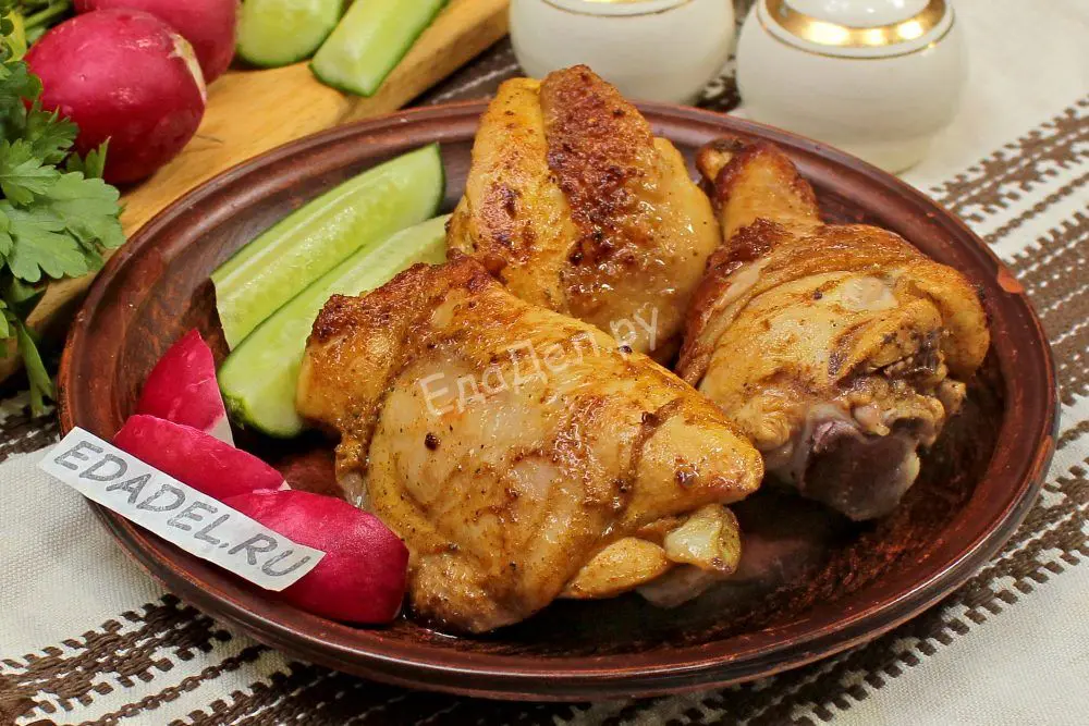 Как только появится золотисто-румяная корочка, огонь еще немного снижаем. Накрываем сковороду крышкой и доводим курицу до готовности. Перед тем, как выключить огонь, снимаем крышку и проверяем насколько хорошо прожарилось мясо. Прокалываем самый крупный кусок ножом или вилкой – из готовой курицы сок вытекает прозрачный. Если есть розоватый оттенок, переворачиваем кусочки и обжариваем еще несколько минут.