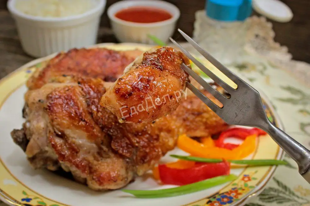 Переворачиваем куски куриного мяса на другую сторону. Тоже обжариваем 7-8 минут, огонь делаем немного слабее. После этого снижаем нагрев до среднего и продолжаем обжаривать, переворачивая каждые 5-6 минут. Со всех сторон появится румяная корочка, внутри курица будет нежной и сочной. Готовность проверяем проткнув большой кусок вилкой – зубцы должны без усилия прокалывать его почти насквозь, сок вытекает прозрачный.