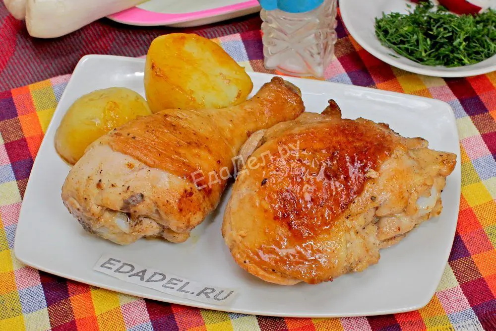 Переворачиваем. Огонь не уменьшаем. Вторую сторону тоже доводим до румяного цвета. После этого снижаем нагрев чуть ниже среднего, накрываем сковороду крышкой. Несколько раз в процессе жарки переворачиваем куски курицы, равномерно подрумяниваем со всех сторон. По времени в общей сложности жарка займет от 30 до 40 минут – курочка станет очень нежной и мягкой внутри, а снаружи образуется аппетитная румяная корочка.