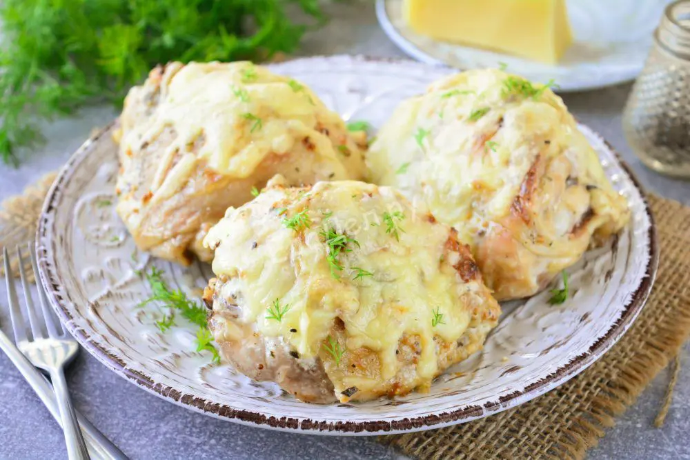Куриные бедрышки сполосните и высушите бумажными полотенцами, натрите солью и черным молотым перцем. Добавьте также для аромата сушеный базилик. Желательно, чтобы куриное мясо было охлажденным – оно вкуснее. Но если в вашей морозилке лежат как раз бедрышки, то просто заранее их разморозьте перед запеканием.