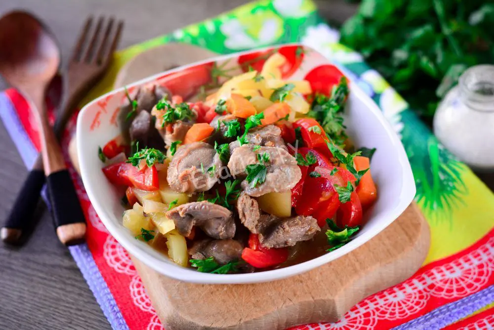 Влейте в сковороду немного воды, грамм 150, тушите куриные желудки с овощами в соусе 25-30 минут. Если у вас будет овощной или куриный бульон – можете и его использовать вместо воды. Желудочки должны стать мягкими и нежными. Овощи придадут им дополнительный аромат и вкус. Проверьте на соль и специи, чтобы сего хватало.