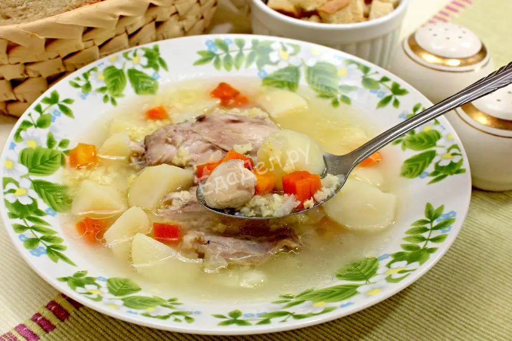 Варим овощи 15 минут, до мягкости. Пшено промываем, заливаем на несколько минут кипятком. Сливаем его и вновь промываем – таким способом удаляем возможную горечь из крупы. Перекладываем пшено в суп и варим еще десять минут. Сильно разваривать крупу не нужно, пшено продолжит размягчаться в горячем супе, пока он настаивается. В самом конце приготовления можно добавить лавровый лист или щедрую порцию петрушки.