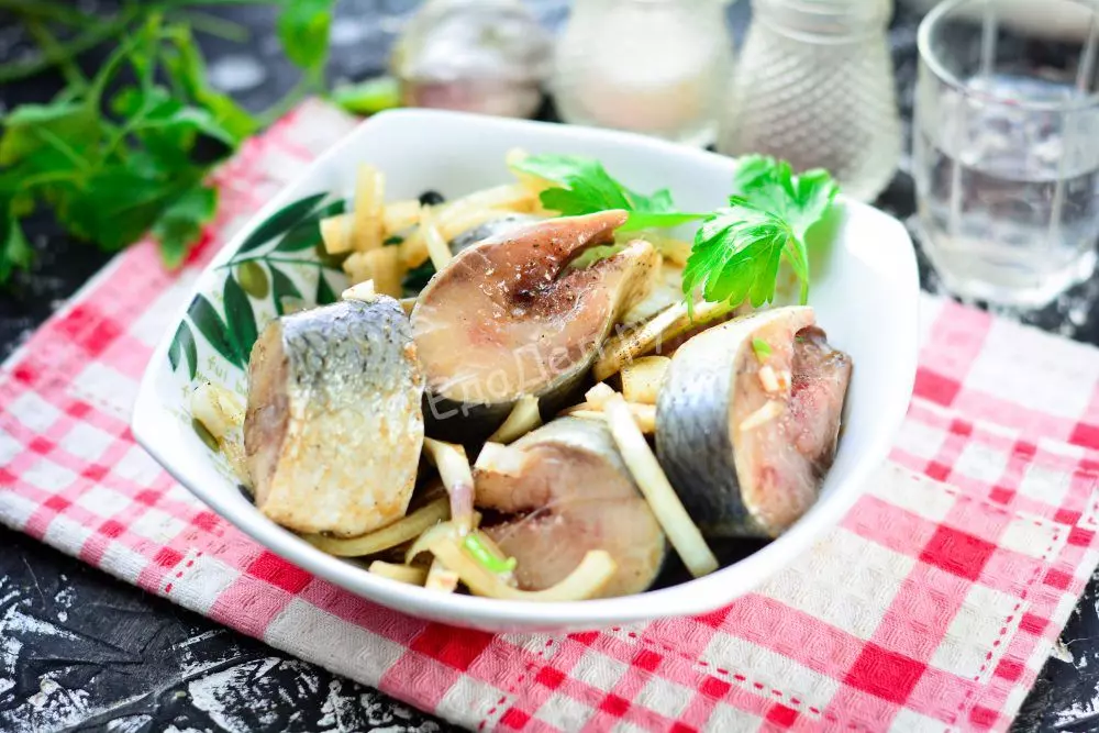 Свежемороженую селедку заранее разморозьте, затем почистите, удалите голову и хвост. Рыба нарежьте средними кусочками – так она быстрее просолится. По желанию можете разделать селедку на филе, удалив все кости. Но кусочками рыба остается более аккуратной по внешнему виду. Хочу отметить, что благодаря уксусу, мелкие кости в селедке буквально становятся мягкими. Так что не бойтесь солить рыбу кусочками.
