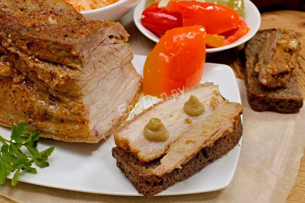 Накрываем вторым листом фольги. Соединяем края. Подворачиваем два-три раза и потом плотно защипываем. Уголки приподнимаем вверх. На противень или в большую сковороду наливаем немного воды и отправляем грудинку запекаться в духовку. Температуру первые полчаса выдерживаем 200 градусов. Потом немного снижаем (до 170-180) и запекаем еще 40-45 минут.