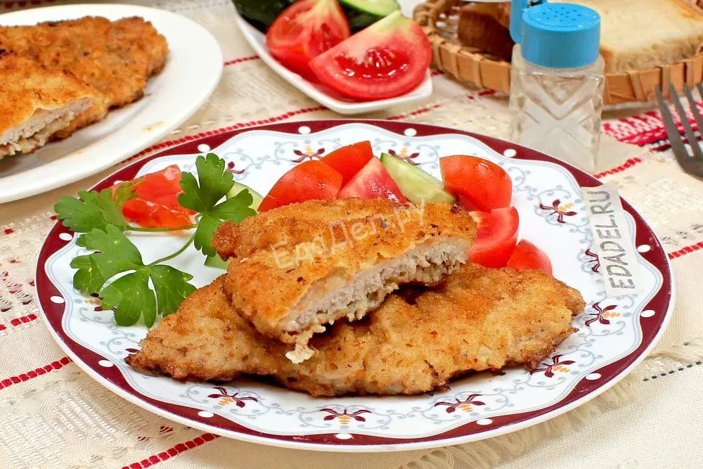 Взбиваем венчиком яйцо до однородности. В другую тарелку насыпаем панировочные сухари. Обмакиваем отбивную в яйцо – яичная болтушка лучше «приклеит» сухари к поверхности мяса. Потом перекладываем в емкость с сухарями. Панируем с двух сторон. Можно слегка прижать ладонью, чтобы они хорошо держались и не осыпались и не горели в масле при обжарке. Излишки стряхиваем.