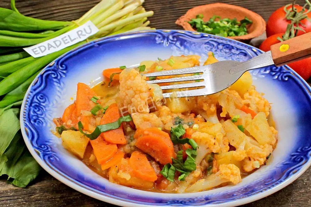Когда овощи дойдут до полуготовности добавляем цветную капусту, разобранную на некрупные соцветия. Предварительно отваривать ее не нужно, она быстро размягчится и будет готова одновременно с остальными овощами. Если планируем приготовить рагу с большим количеством подливки, добавляем еще воды до желаемой консистенции. Не забываем положить лавровый лист – он сделает рагу ароматнее.