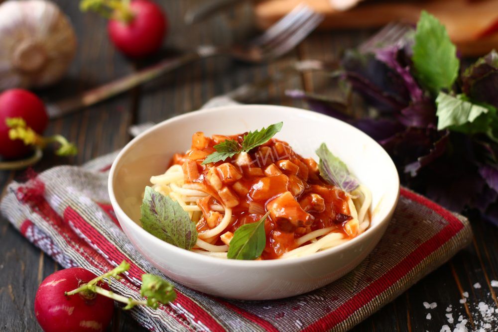 Для этого соуса подойдет любое подкопченное мясо (курица, свинина и пр.), колбаса, сосиски, мясные деликатесы. Словом, все, то у вас найдется в холодильнике. У меня в этот раз была свиная грудинка. Зачищаем ее от всего лишнего (пленки, шкурки) и нарезаем небольшими кусочками. С лука снимаем шелуху, промываем и также рубим кубиком.