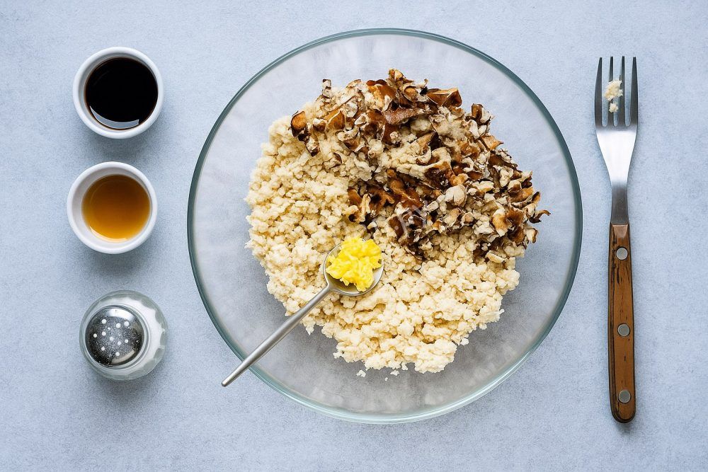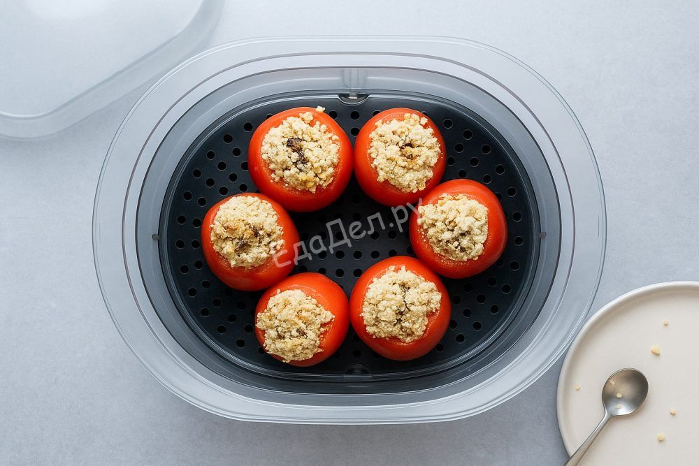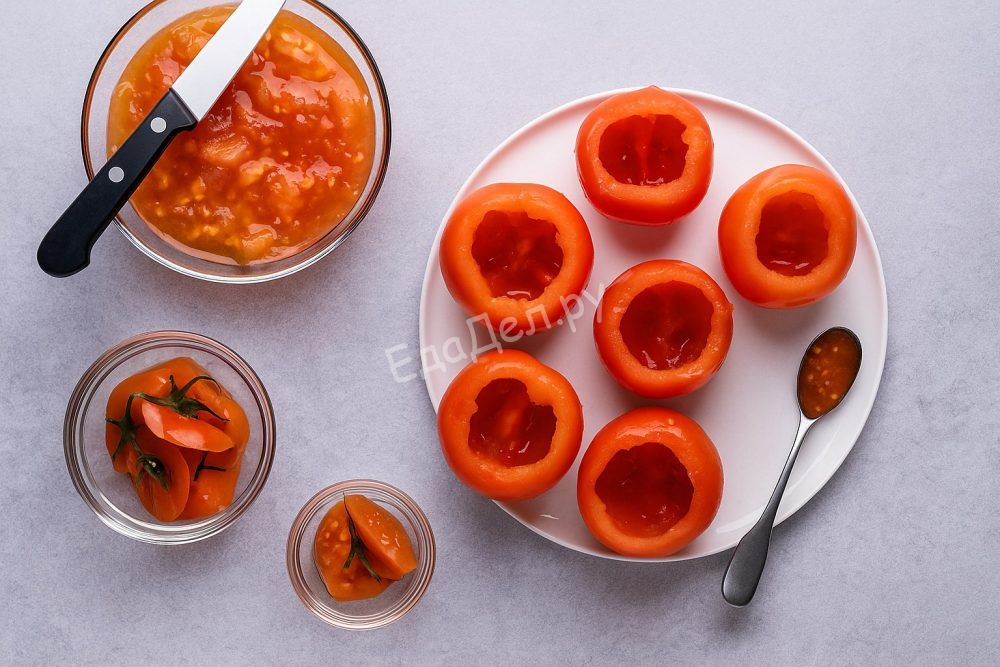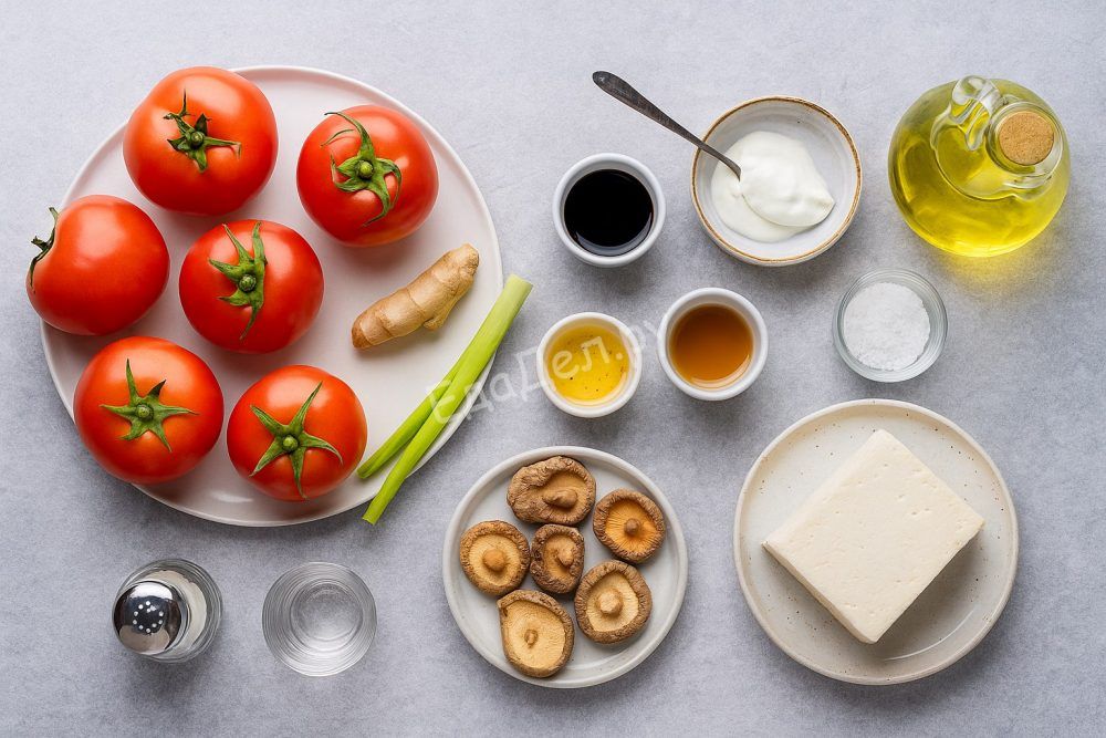 Влейте томатное пюре, добавьте соевый соус, уксус, щепотку соли и сахара; доведите до кипения, затем тонкой струйкой введите крахмальную смесь, помешивая. Варите до загустения 1–2 минуты, отрегулируйте баланс соли/кислоты/сладости. Готовые фаршированные помидоры выложите на блюдо и полейте горячим соусом.