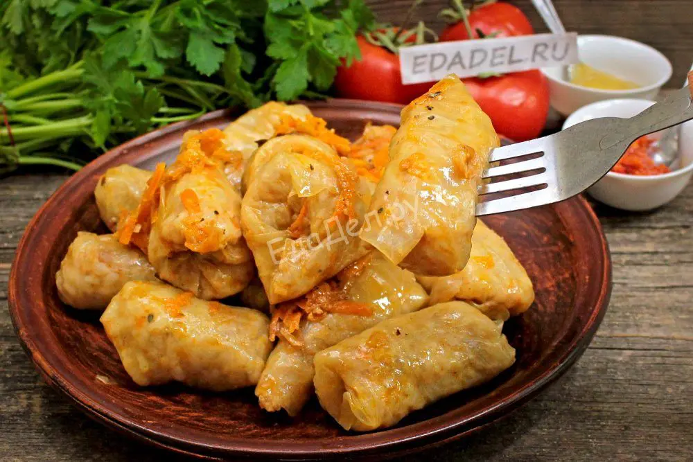 Набираем чайную ложку начинки, сжимаем в ладони, чтобы получился конус или овал, начинка должна быть плотной, не разваливаться. Кладем на край капустного листа и сворачиваем или кулечком, или конвертиком. Свернутую заготовку тоже слегка сжимаем в ладони – так она лучше зафиксируется и не развалится при тушении.