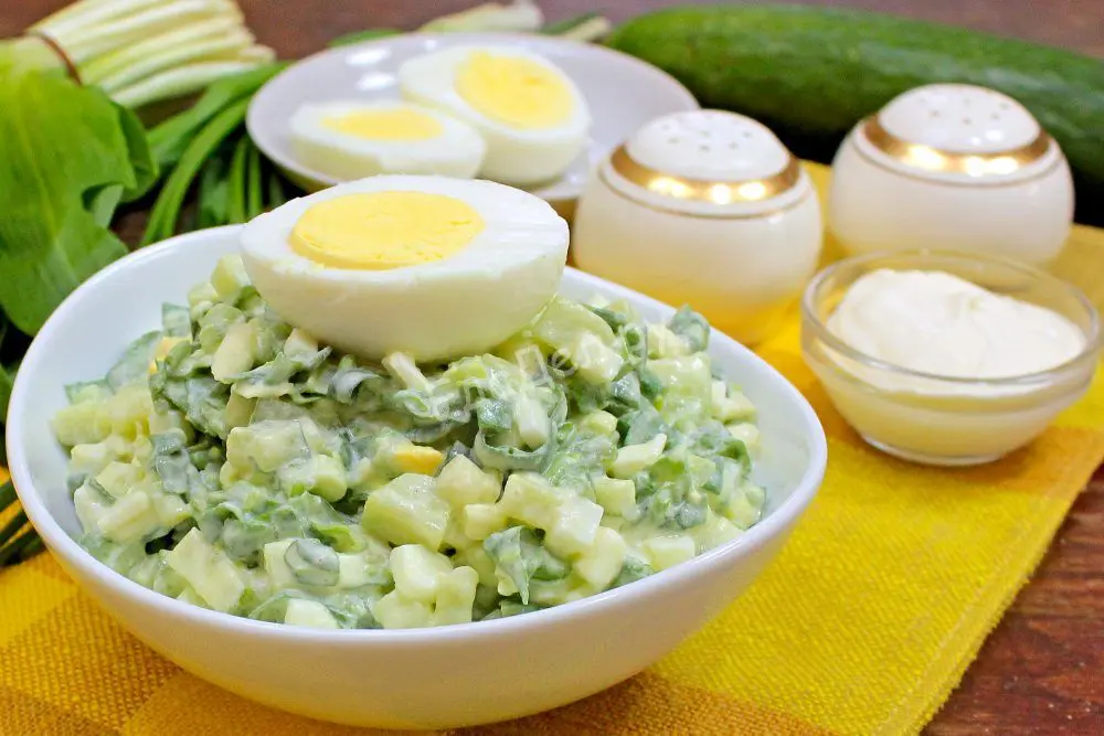 Весной еще нет грунтовых огурцов, а у тепличных обычно кожица жесткая, грубая. Лучше ее частично срезать, а если огурец горчит, то удалить полностью. Какой будет нарезка не столь важно. Кому-то нравится хрустящий салат – тогда нарезать кубиками, соломкой или ломтиками. Если любите мягкий, нежный вкус – натрите огурцы на крупной терке.