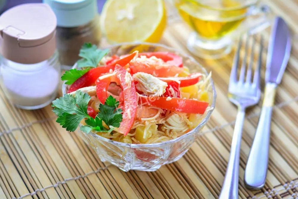 Картофель заранее отварите до мягкости в мундире. Варите картофель в кипящей воде 20-25 минут. Проверить готовность можно ножом, чтобы он хорошо входил в картошку. Остывший картофель почистите и нарежьте небольшими кубиками для салата. Также предварительно сварите куриное филе. Мясо курицы сполосните и выложите в кипящую воду, добавьте по вкусу немного соли и варите филе минут 20. Затем остудите его прямо в бульоне – так филе стает сочнее. Потом бульон можете использовать для приготовления любого супа. Куриное филе разделите на волокна – длинные полоски.