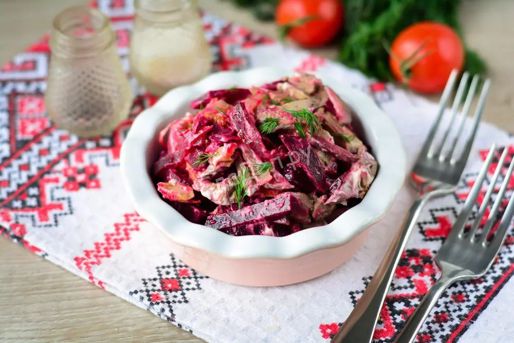 Первым делом отварите свеклу. Советую сделать это заранее, тогда сала будет готов еще быстрее. Свеклу тщательно промойте и положите в кастрюлю, залейте холодной водой и поставьте на огонь. После закипания воды, варите свеклу при небольшом бурлении 45-50 минут. В конце варки они должна стать мягкой, проверьте готовность при помощи ножа, полностью проколов. Нож должен легко входить. Сваренную свеклу полностью остудите, затем почистите и нарежьте соломкой для салата.
