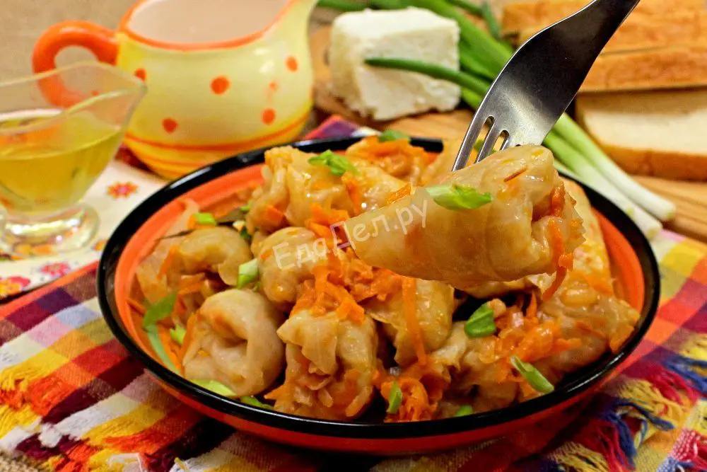 Подготавливаем капустные листья. Аккуратно разбираем кочан на отдельные листочки. Те, что возле самой кочерыжки (внутри) очень мелкие – ими можно выстлать дно казанка или порезать и разложить между слоями. Отваривать или ошпаривать капусту не нужно, она уже готова для фаршировки. Каждый лист разрезаем вдоль пополам по толстой жилке – ее вырезаем. Получатся как бы две полусферы. Разрезаем каждую половинку еще пополам. Набираем примерно чайную ложку начинки и руками формируем колбаску. Кладем на одну сторону капустного листа. Закрываем свободным краем и затем закручиваем, делаем несколько оборотов, точно так же, как закручиваем кулечек. Краешки, которые будут выступать над начинкой, проталкиваем внутрь, как бы запечатывая кулечек. Если такая формовка для вас сложная, просто заверните конвертиком, как обычные голубцы.