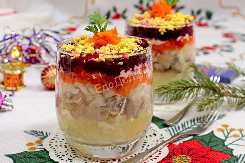 На лук выкладываем слой из натертой на мелкой терке моркови. Уплотняем так, чтобы поверхность была ровной, а в стакане были видны все слои. Обильно смазываем майонезом. Закрываем морковь свеклой, натертой на мелкой терке. Очень сочную слегка отжимаем, чтобы удалить лишнюю жидкость из салата. Разравниваем верх, накрываем стаканы и ставим в холодильник до подачи.