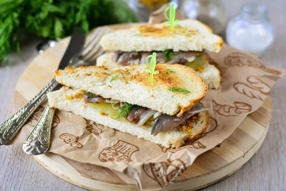 Заранее отварите картофель в мундире до мягкости. Тщательно вымытые корнеплоды варите в кипящей воде 20-25 минут. Готовность проверьте ножом, чтобы картошка хорошо прокалывалась. Сваренный картофель остудите и почистите. Если это сделать с вечера, то утром приготовить вкусный завтрак займет у вас не более 15 минут. Также сваренный вчера картофель будет хорошо нарезаться ровными ломтиками. Итак, нарежьте сваренный картофель средними кружочками. Почищенный репчатый лук нарежьте полукольцами. С луком сэндвич будет слегка остреньким и к тому же лук идеально сочетается с анчоусами.