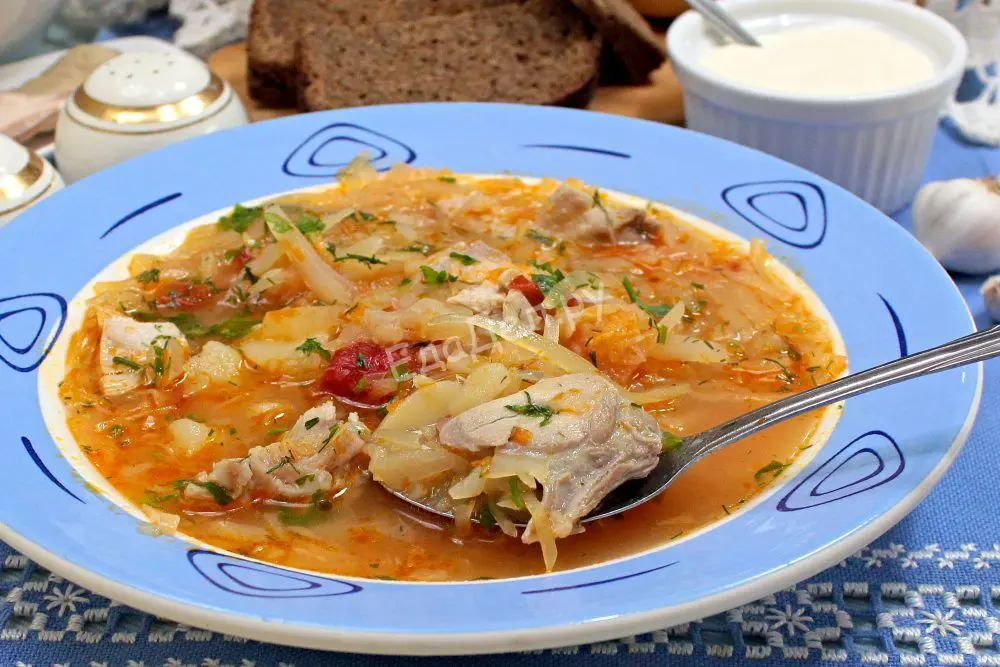 Куски курицы кладем в кастрюлю, вливаем два литра воды и доводим до кипения. Пену собираем. Для щей не так важен прозрачный бульон, как для супов, поэтому можно варить его на среднем, а не на самом тихом огне. Варим куриное мясо 15-20 минут. Затем добавляем половину очищенного картофеля. Мелкие клубни оставляем целыми, крупные режем на несколько частей. Варим картошку до готовности. В процессе варки солим по вкусу.