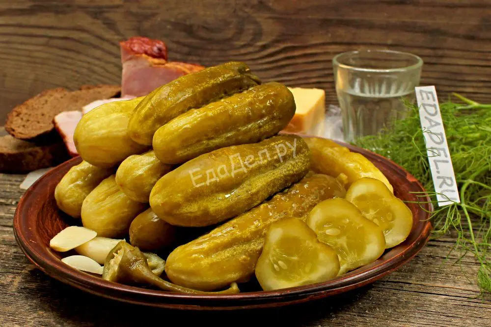 Солить огурцы удобнее в большой эмалированной кастрюле или ведре (эмалированном или из пищевого пластика). На дно кладем все пряные добавки, примерно треть: рвем на небольшие кусочки листья хрена, разламываем стебли укропа на несколько частей, добавляем листья черной смородины и вишни. Туда же отправляем пару долек чеснока и два-три колечка острого перца. Выкладываем один-два слоя огурцов. Закрываем такими же пряными добавками, как и выстилали дно. Так перестилаем пока не закончатся огурцы. Верх обязательно прикрываем листьями хрена и укропом.