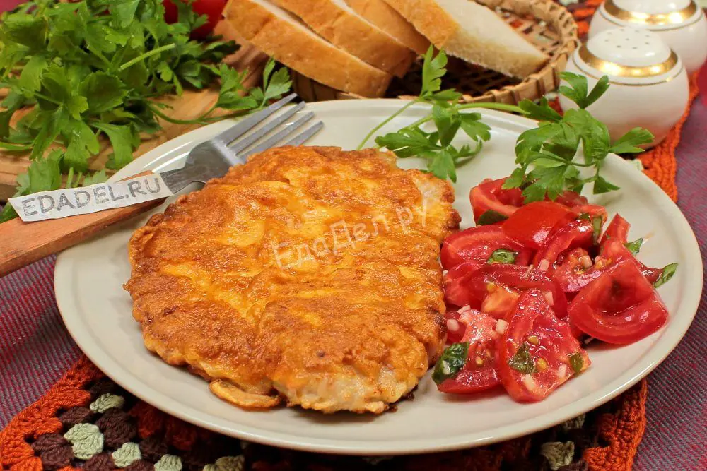 Как только снизу отбивная подрумянится, переворачиваем и поджариваем вторую сторону тоже до золотисто-румяной корочки. Потом нагрев снижаем до слабого и обжариваем мясо еще по две-три минуты с каждой стороны. Внутри оно станет очень мягким, сохранит сочность, сверху образуется равномерная румяная корочка.